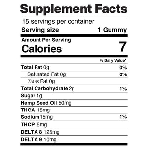 Ingredients: Hemp-Derived Cannabinoids, Tapioca Syrup, Cane Sugar, Pectin, Sodium Citrate, Distilled Water, Natural Flavor, Natural Colors, Citric Acid Solution.